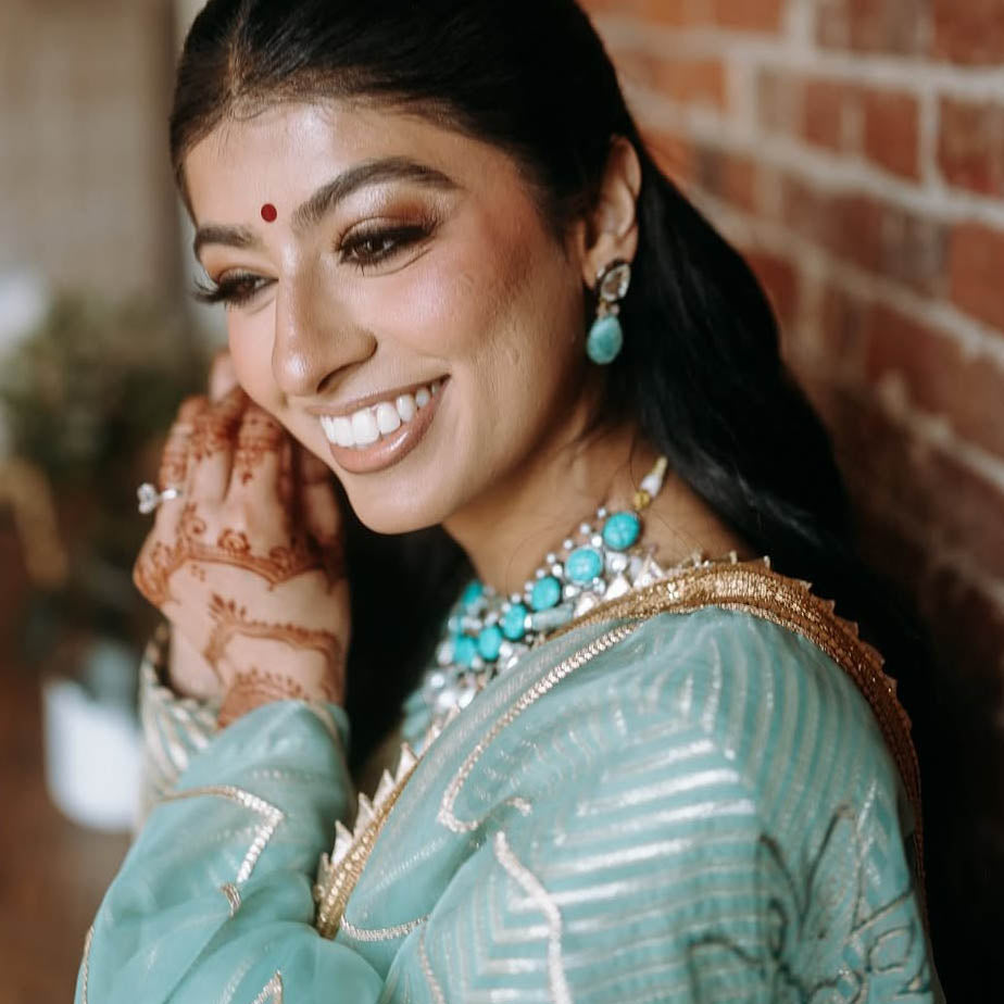 The look includes a necklace, a matching maang teekah and a pair of beautiful earrings.