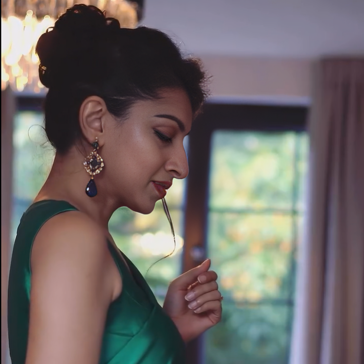 The look includes a pair of earrings featuring striking green and blue stones, shimmering CZ accents, and a dramatic navy drop, this exquisite pair radiates royalty and modern glam. Approximate earrings length is.
