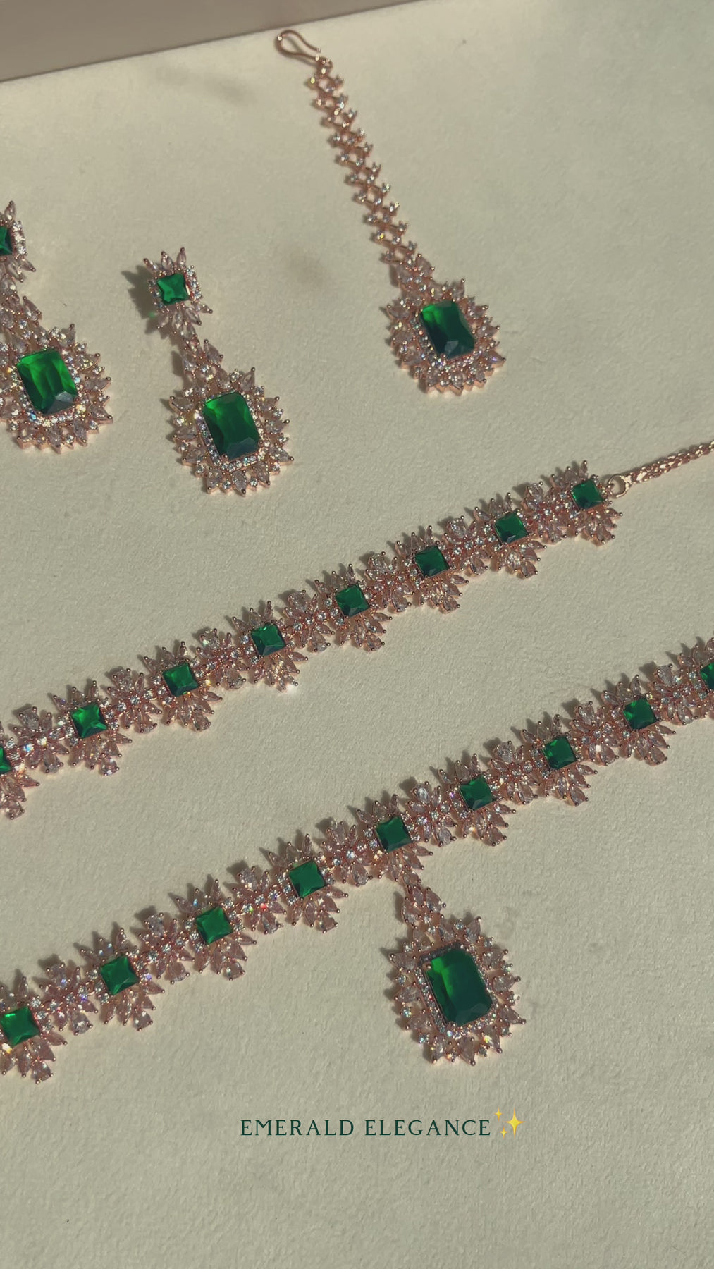 The look includes a choker paired with a necklace, a matching teekah and a pair of beautiful earrings shimmering set with CZ and emerald stones creating a flawlessly fresh finish for each and every one of your evening ensembles. Approximate earrings length is 2.1".