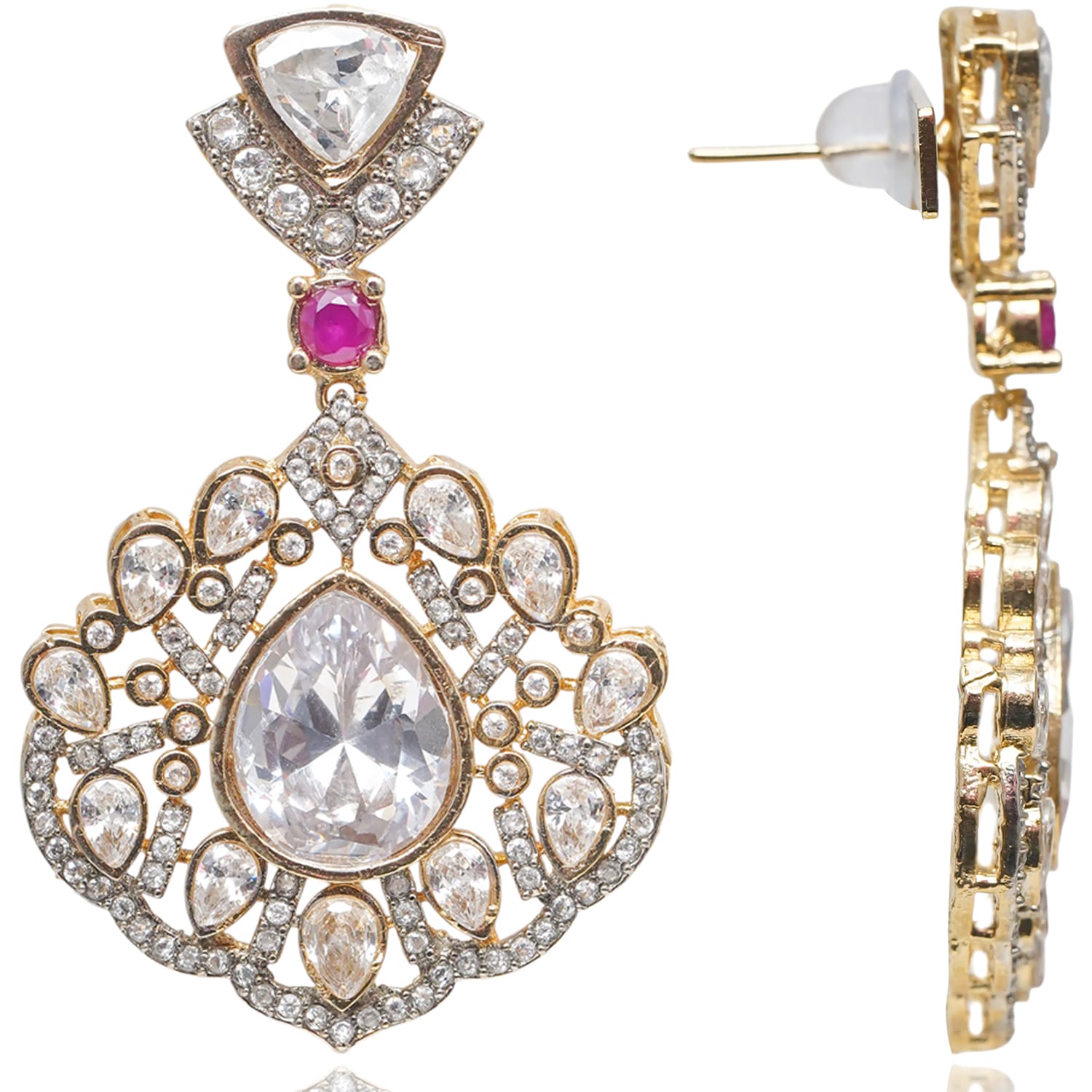 Crafted for the modern diva with a love for heritage, this masterpiece blends traditional artistry with a glamorous edge. Featuring hand-set uncut polki kundan accents radiating vintage charm and vivid ruby accents for a bold, contemporary twist, this set is a symphony of pear-cut designs cascading with intricate elegance.