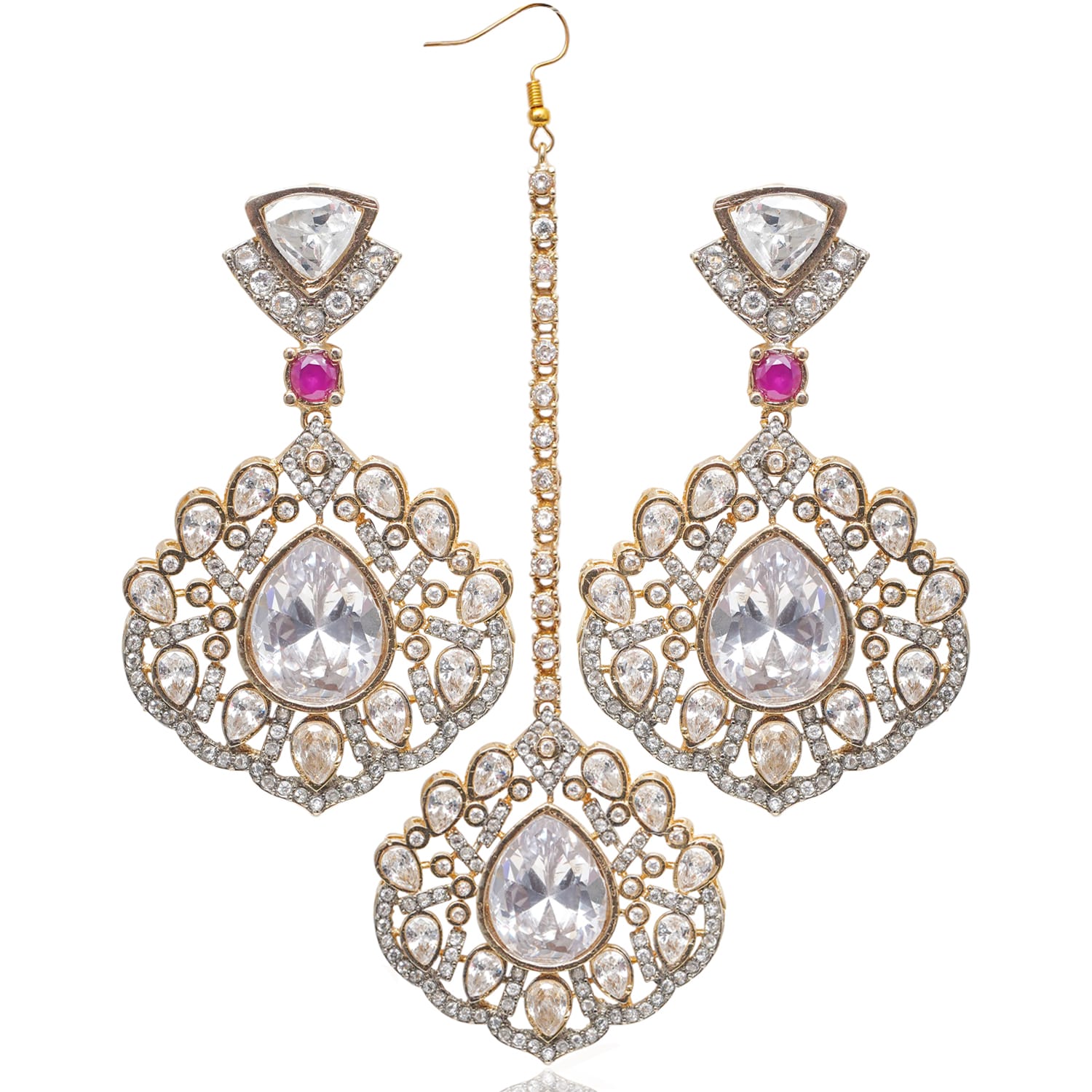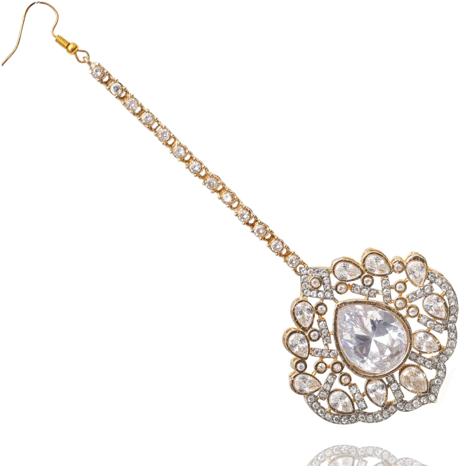 The look includes a necklace, a maang teekah and a pair of earrings.