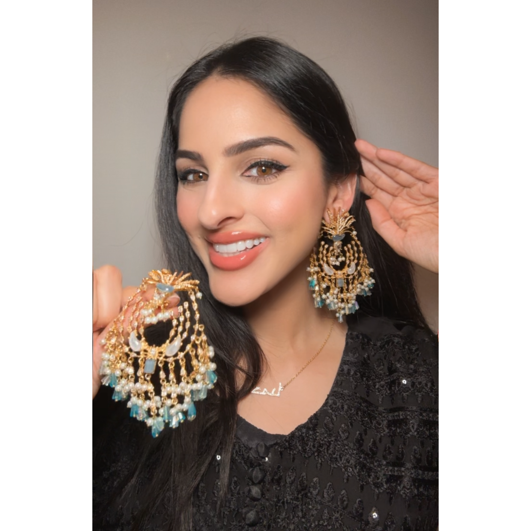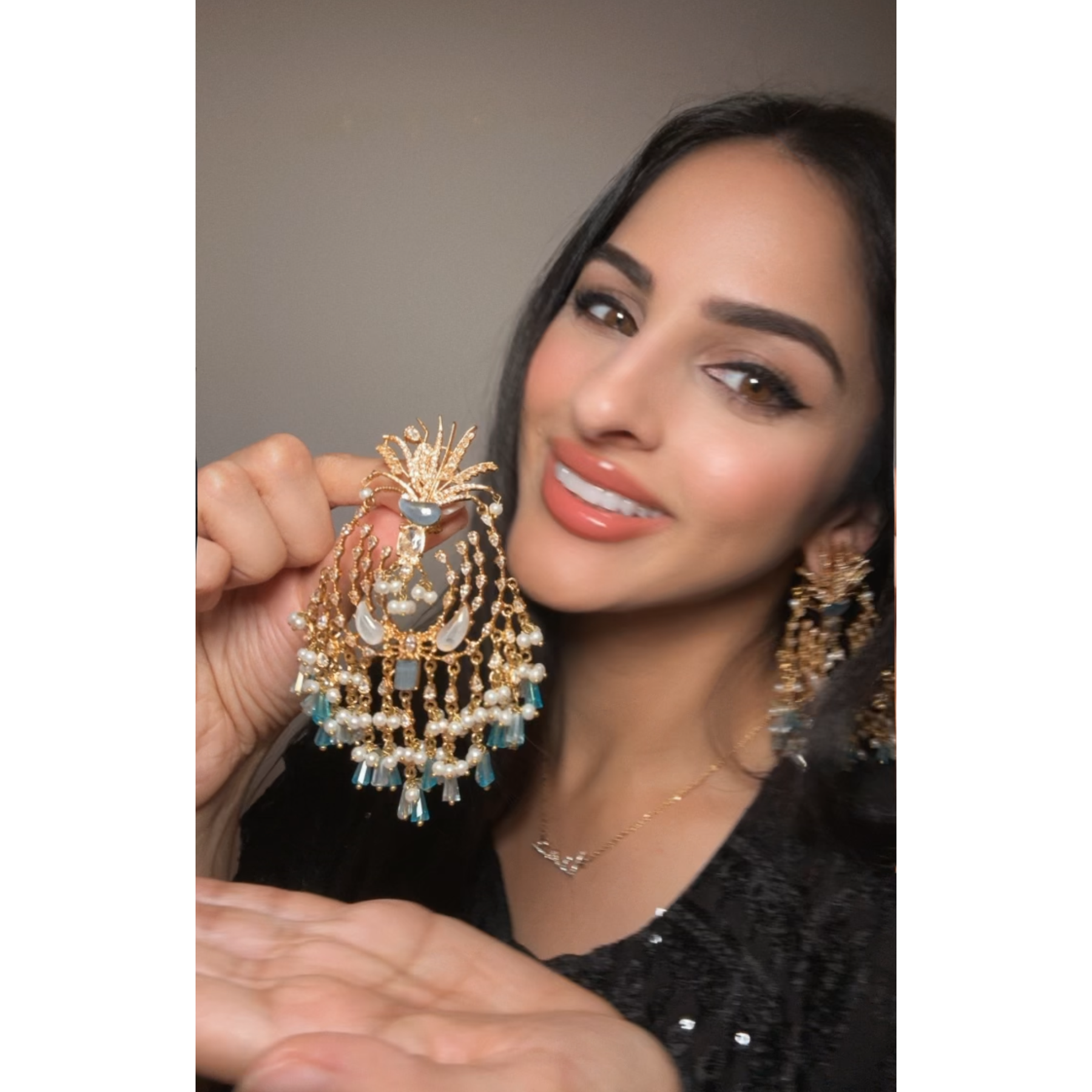 Channel the inner glamour with our statement earrings, featuring intricate craftsmanship, delicate blue stones, and a cascade of elegance, this pair adds an enchanting charm to your evening look - making it a masterpiece for modern royalty. Approximate earrings length is 4".