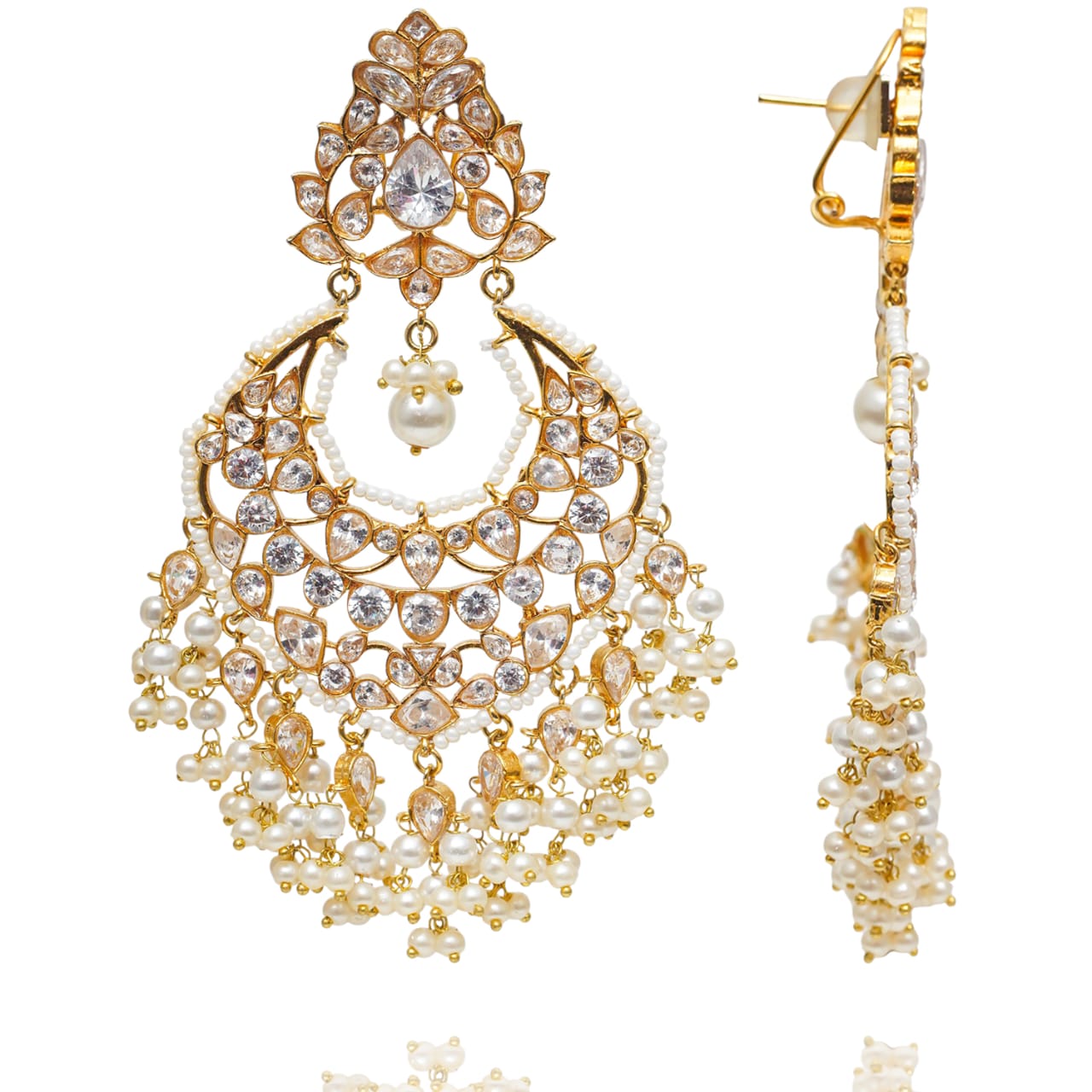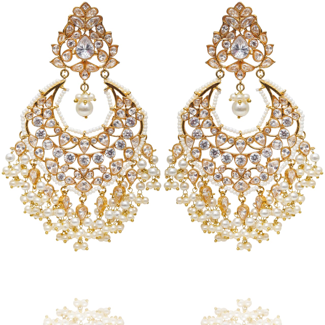 The look includes a pair of beautiful earrings complemented with a classic over-sized maang teekah fashioned out of kundan stones and pearl moti.