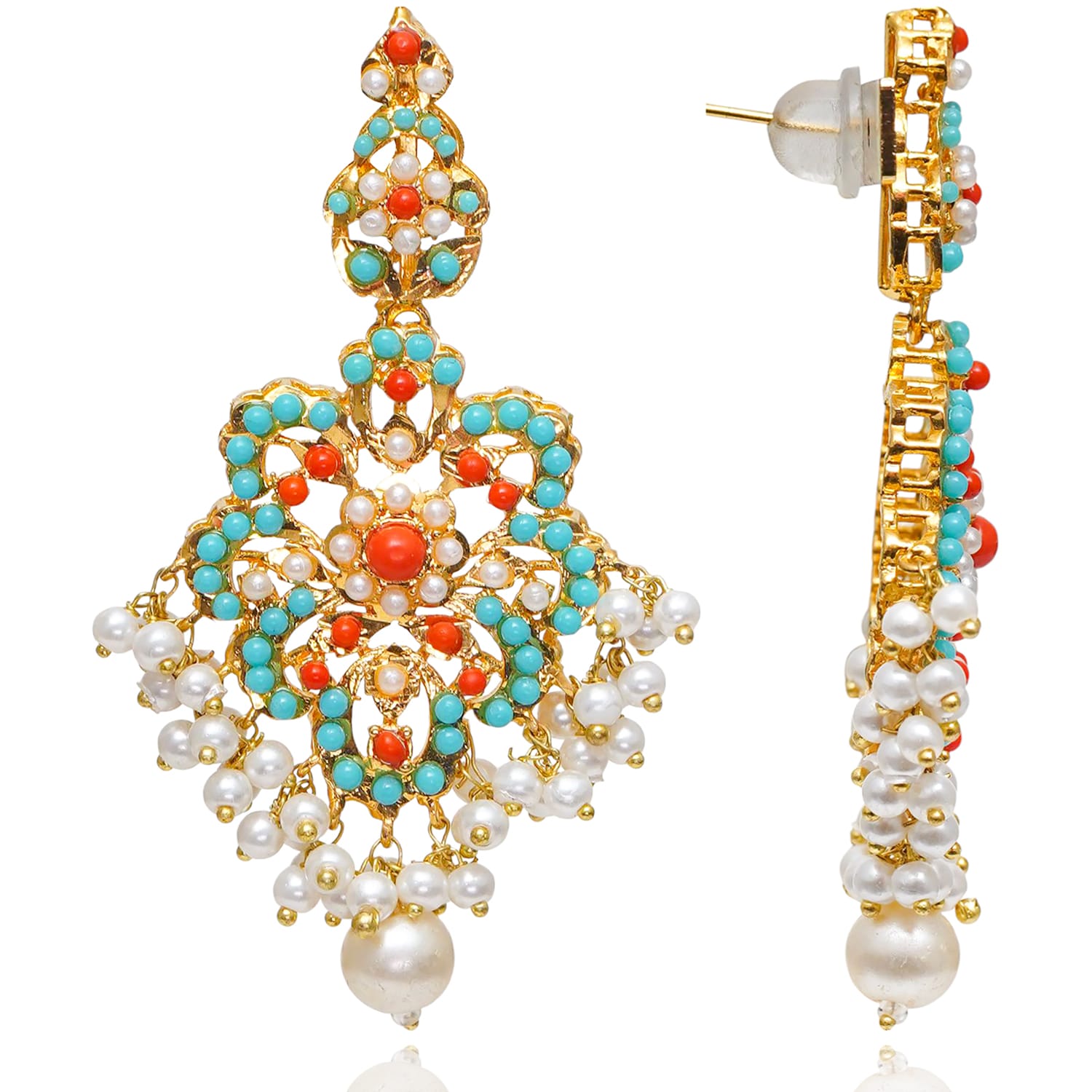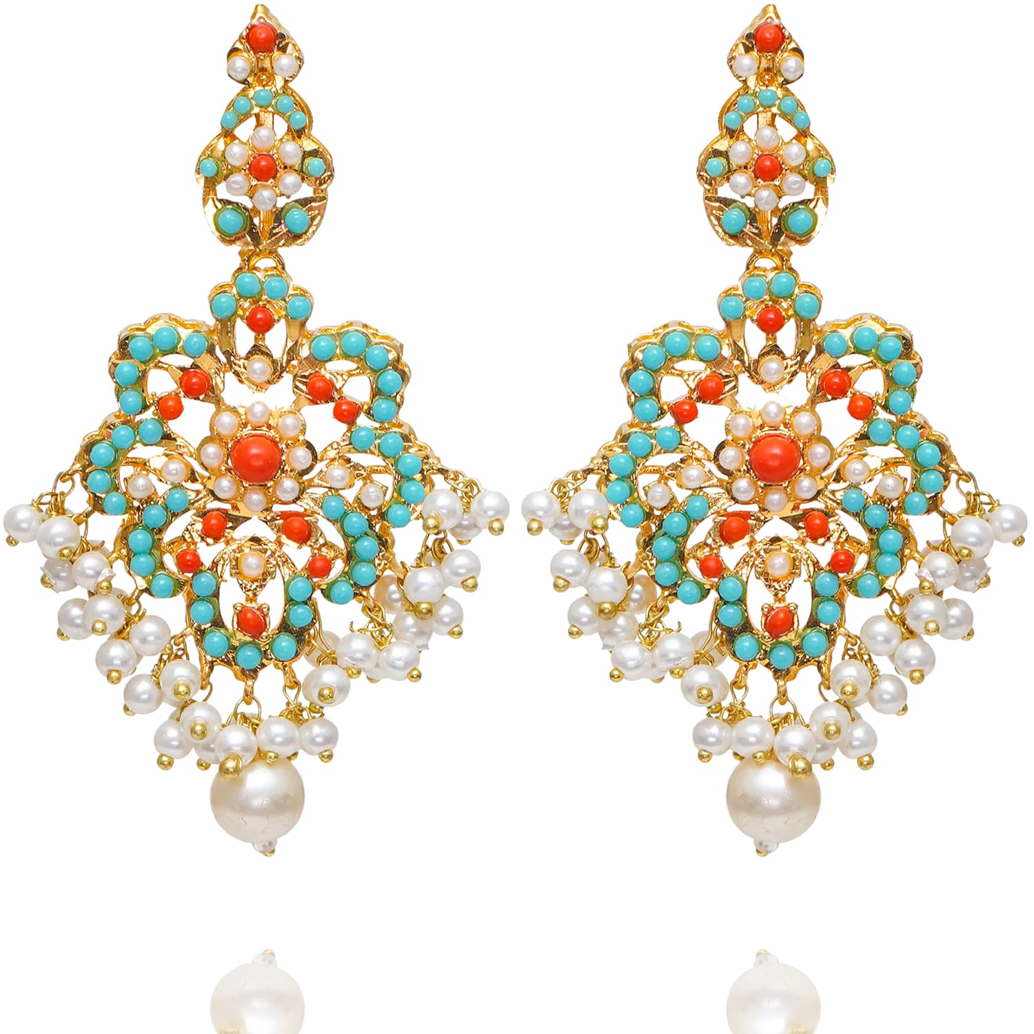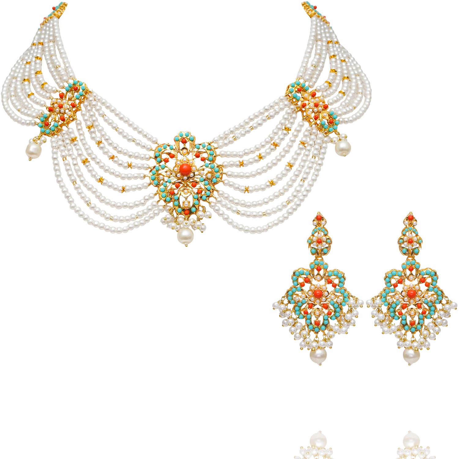 Indulge in timeless opulence with this exquisite handcrafted jewelry set, a symphony of luminous pearls, intricate gold filigree, and delicate orange and feroza accenting beads.
