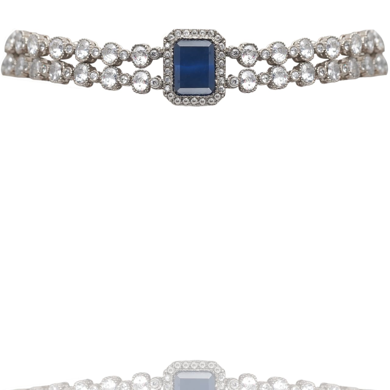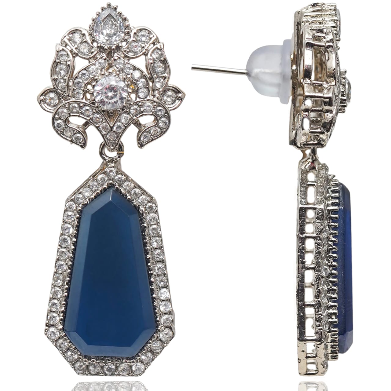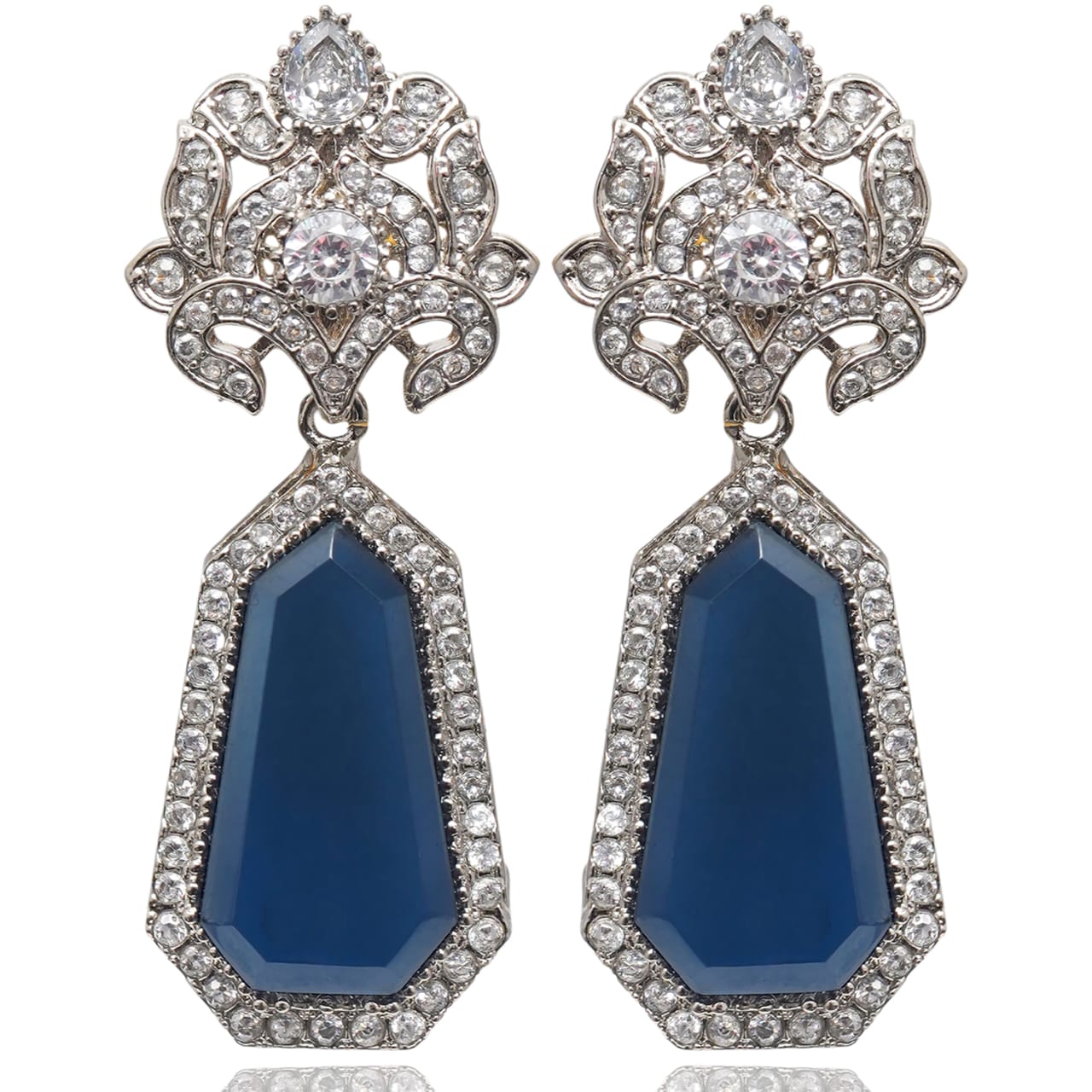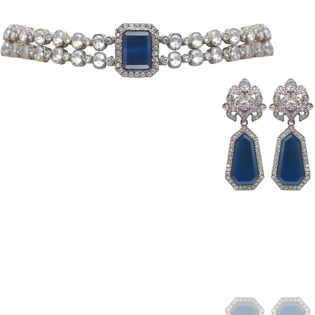 Beautiful jewelry set featuring royal blue stones framed in shimmering zircons.