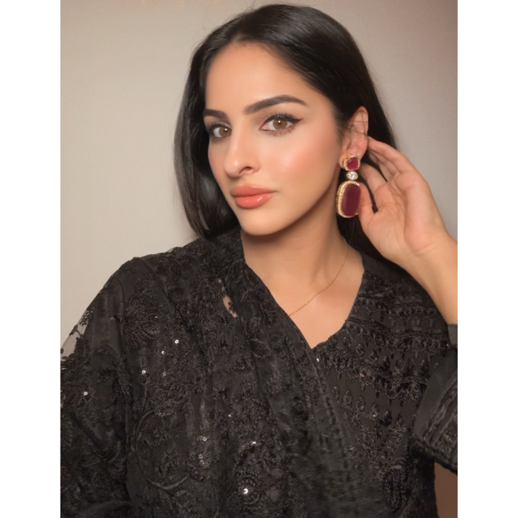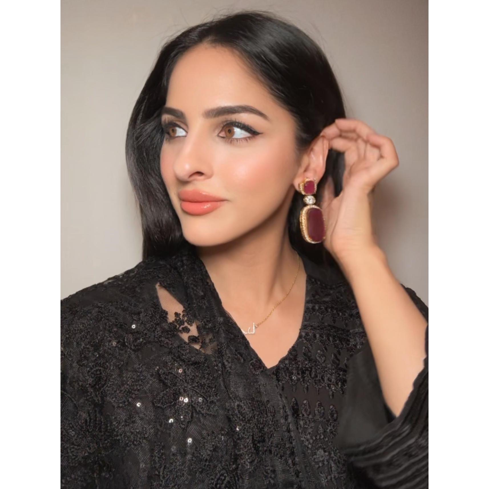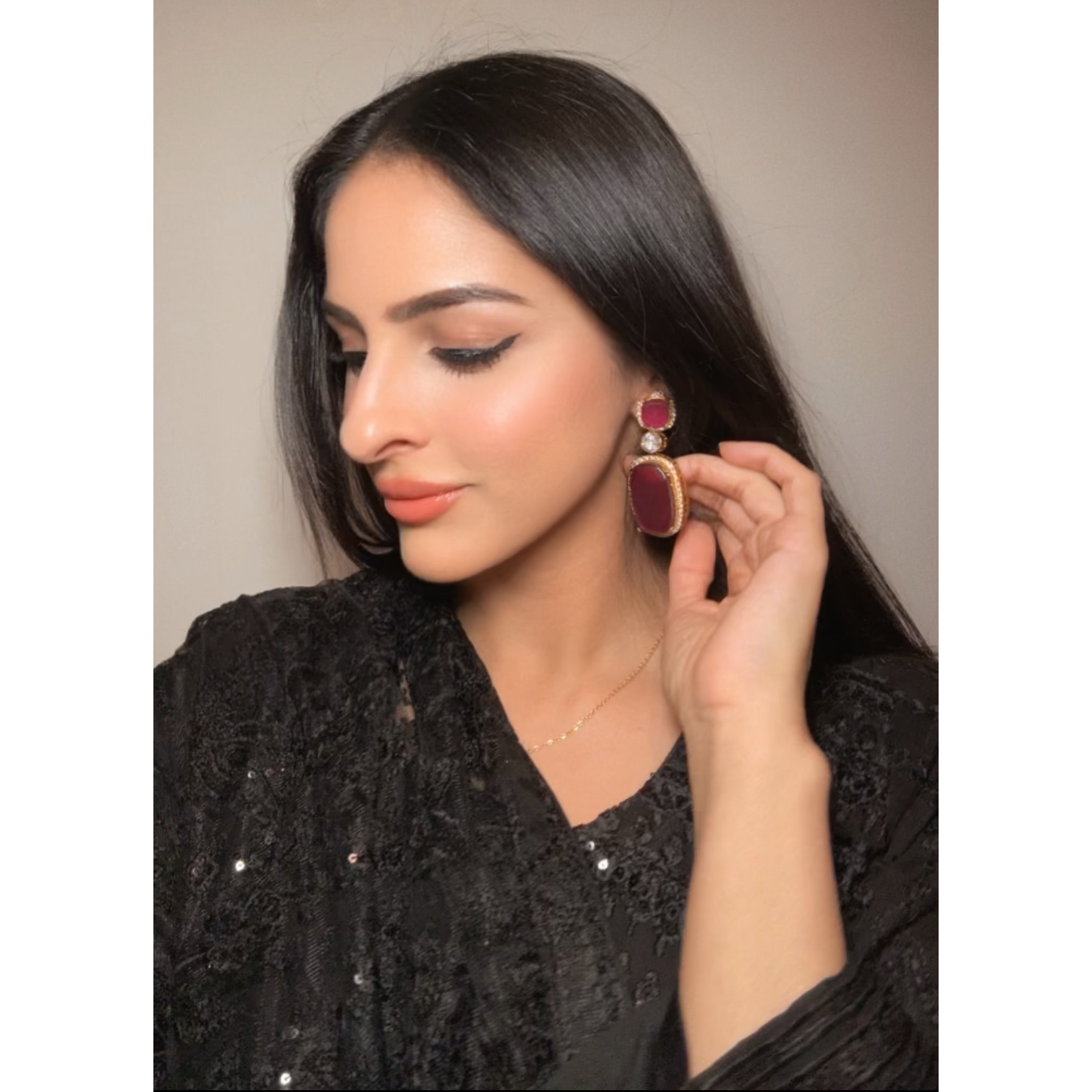 The look includes a pair of earrings crafted with exquisite precision featuring luminous, hand-cut burgandy stones, gracefully framed by opulent CZ stones - a statement of refined luxury, these earrings are destined to elevate your ensemble with celestial charm. Approximate earrings length is 2.5"