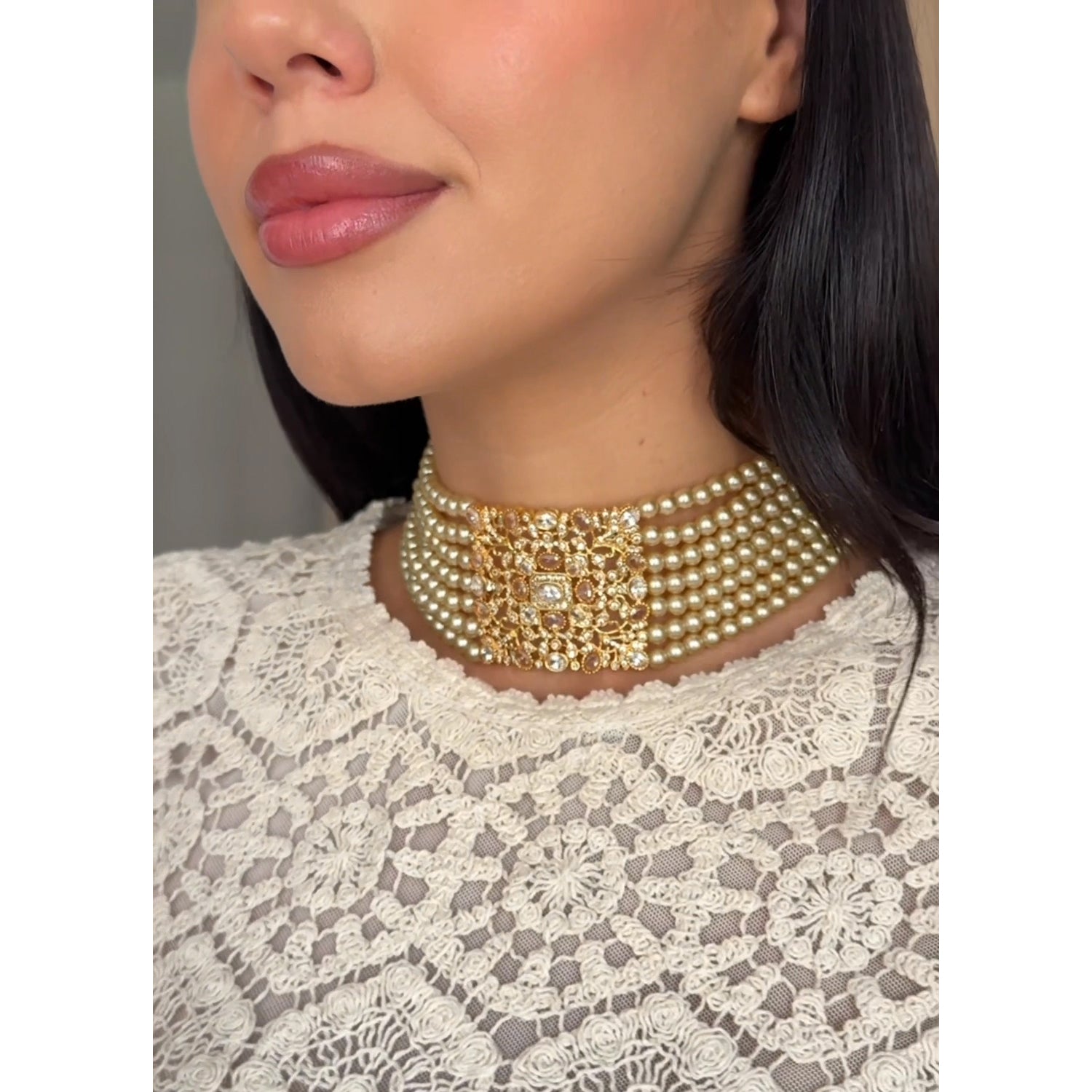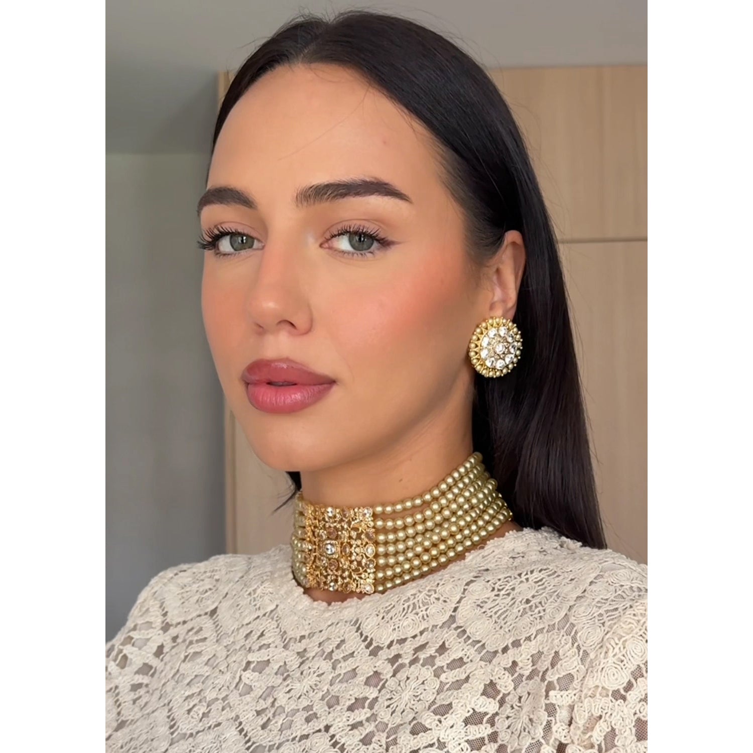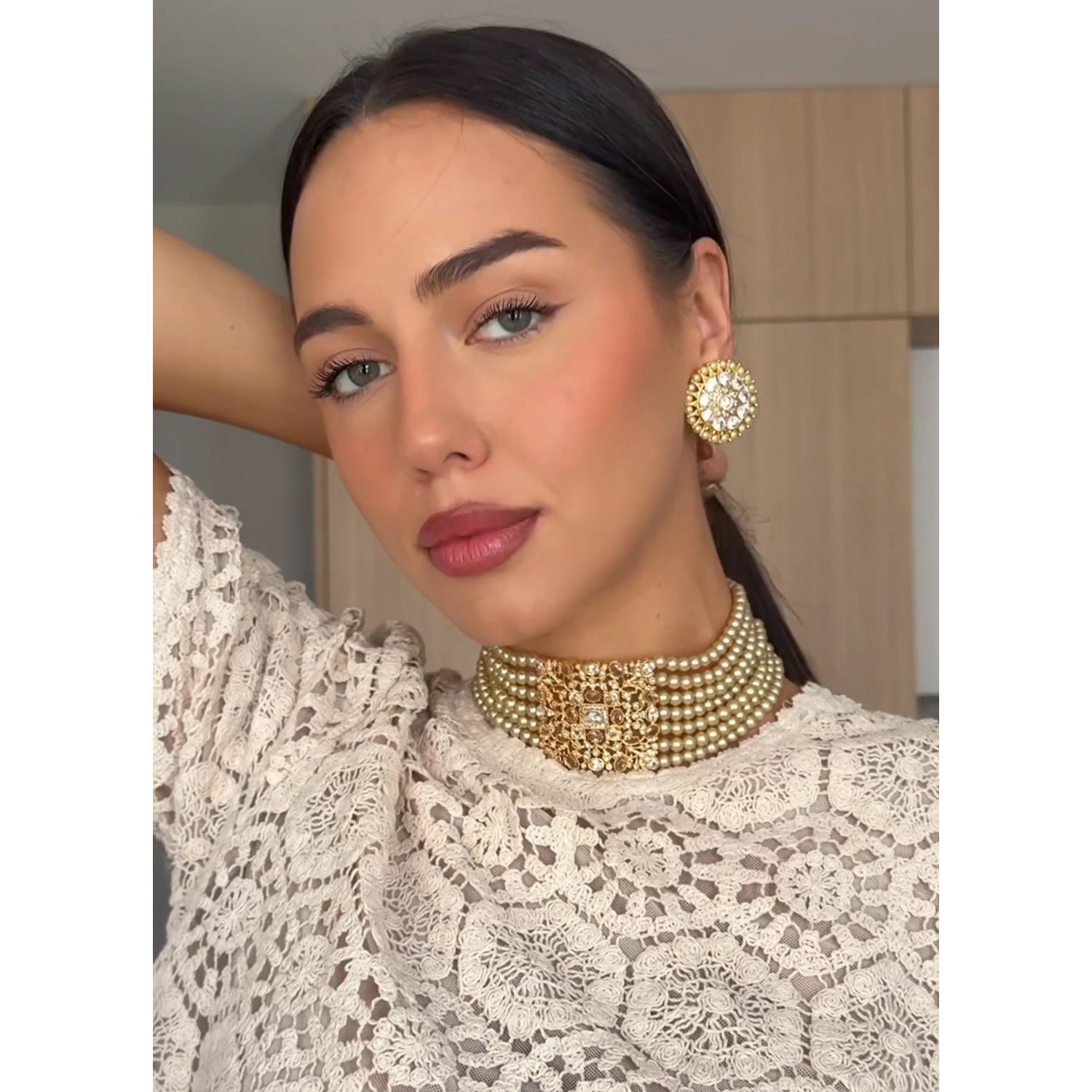 A masterpiece of elegance, this exquisite pearl choker set features lustrous pearl strands, intricate gold filigree, and dazzling zircons, it exudes royal charm and timeless grace. Approximate earrings length is 1.3".