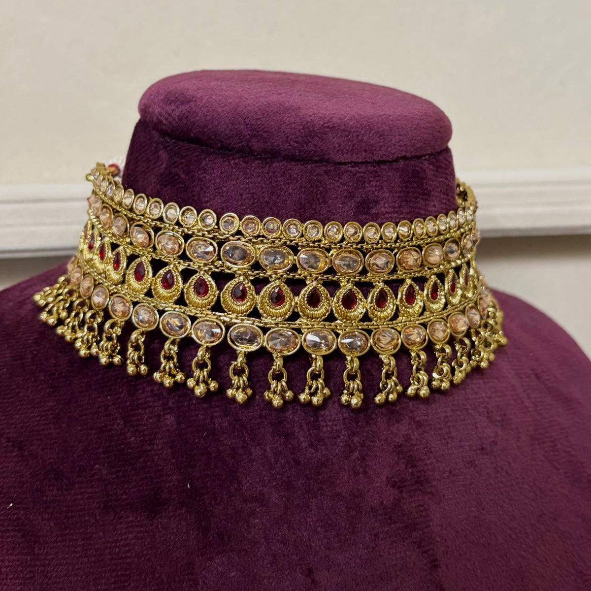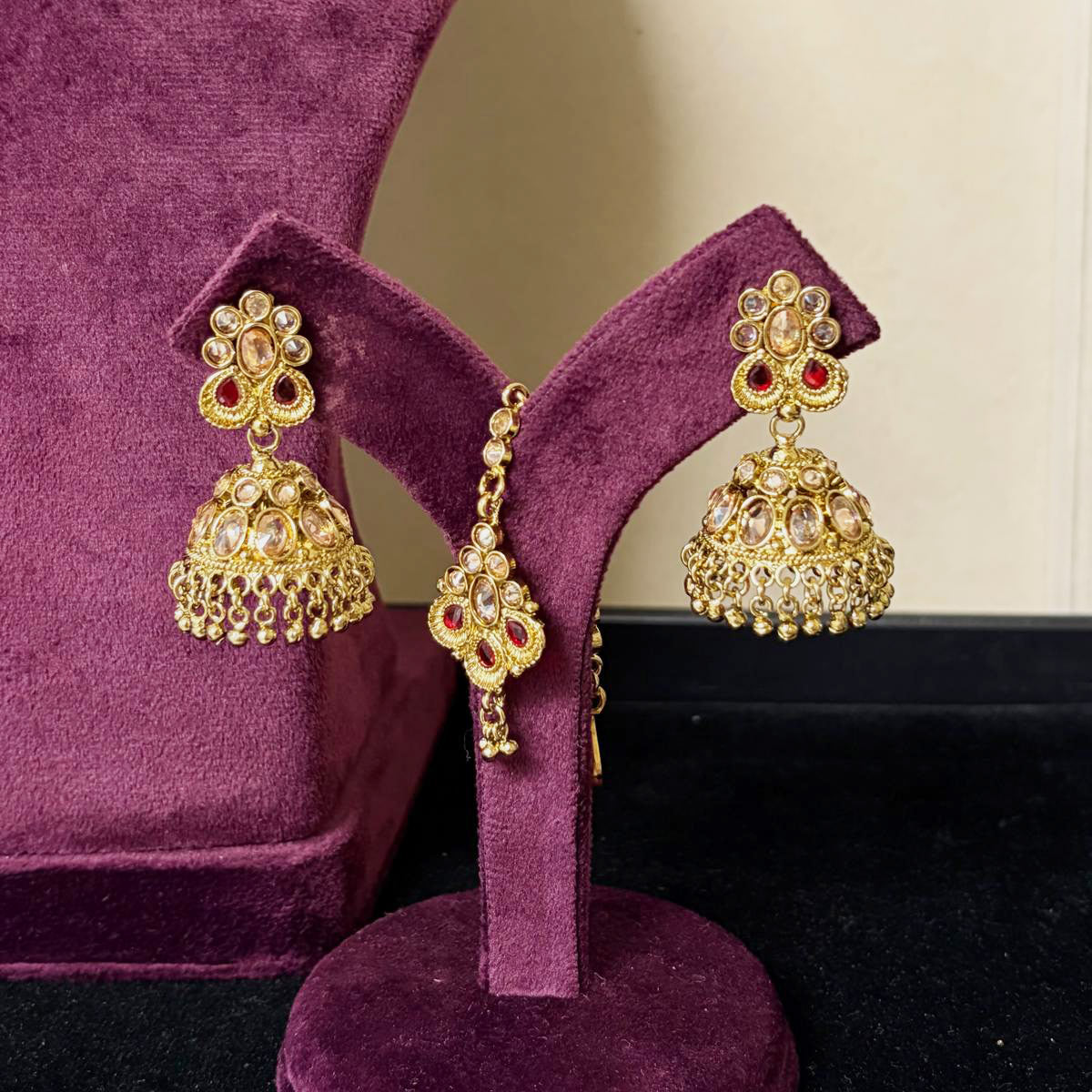 The set includes necklace, a maang teekah and a pair of earrings. Approximate earrings length is 1.75" in length.