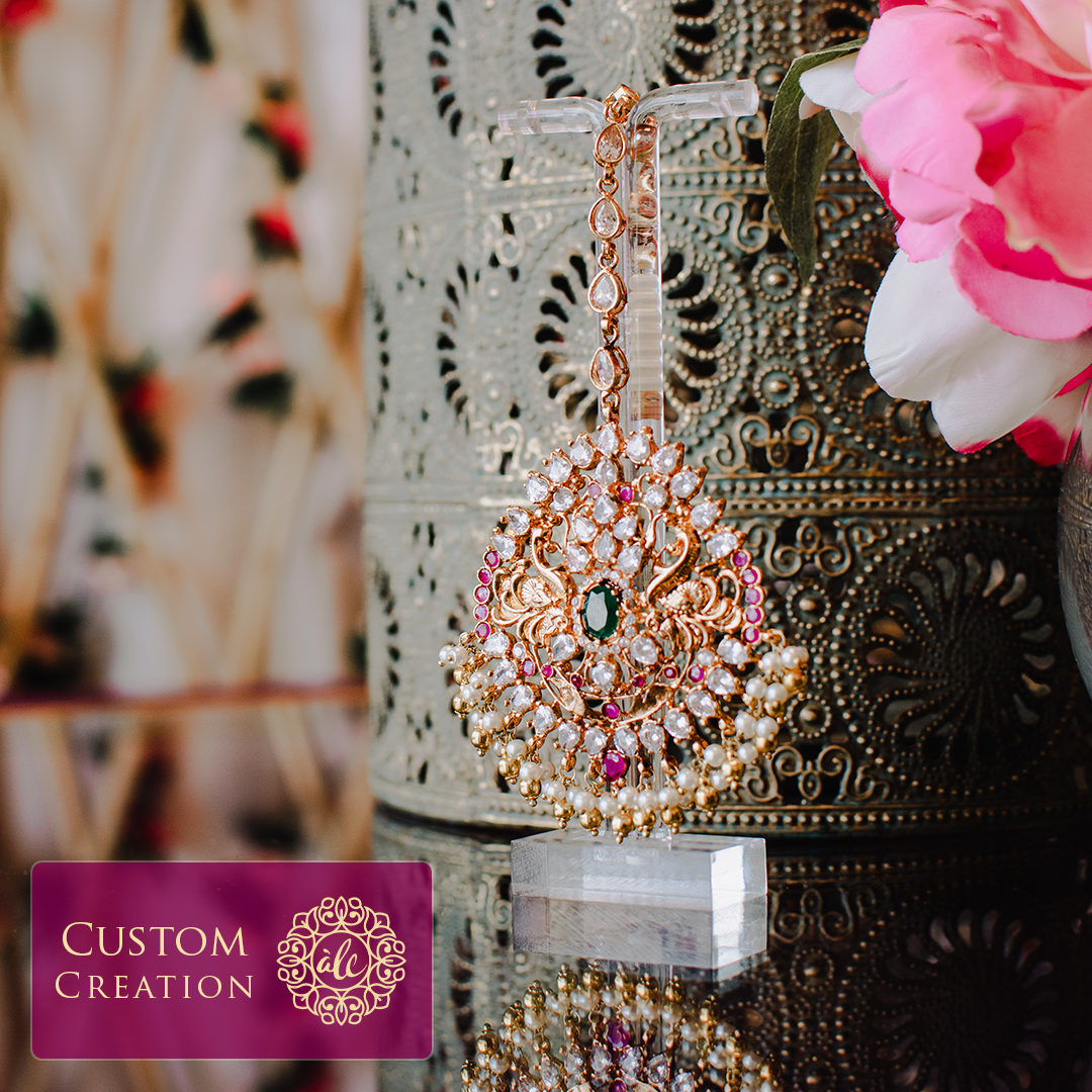 The look includes an exquisite pair of earrings and teekah crafted with stones and golden pearl beads. Approximate earrings length is 3".