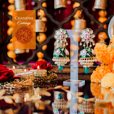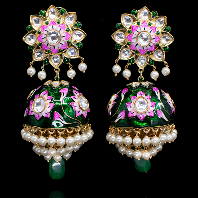 A pair of stunning jhumkey earrings enameled in bright pink and green meenakari and embellished with kundan stone. Approximate earrings length is 3".