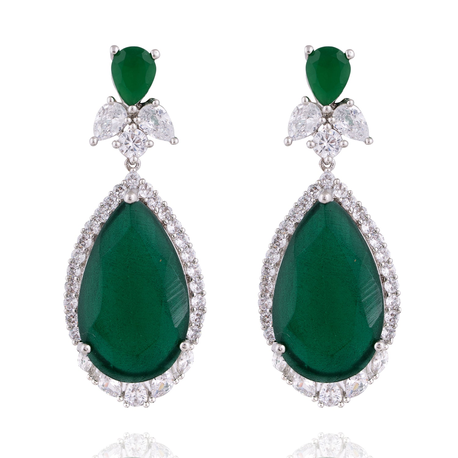A luxurious set featuring rich emerald-green drop-cut stones framed with shimmering CZ accents.