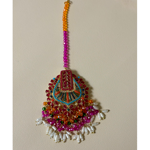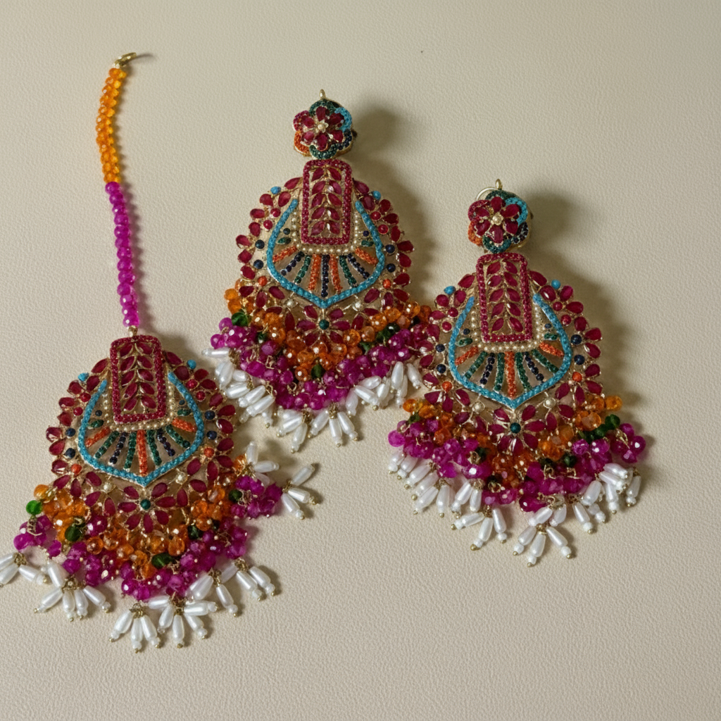 A breathtaking ensemble featuring multicolor chandbali earrings and a matching maang teekah.