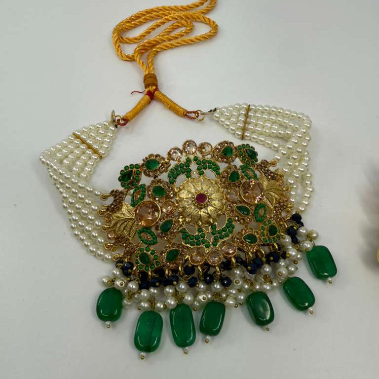 Indulge in elegance with our enchanting choker set, adorned with cascading emerald beads and delicate green moti embellishments - designed to grace the neckline with pearls that exude timeless charm and boasting with captivating emerald and champagne stones to radiate sophistication and allure with every sway.